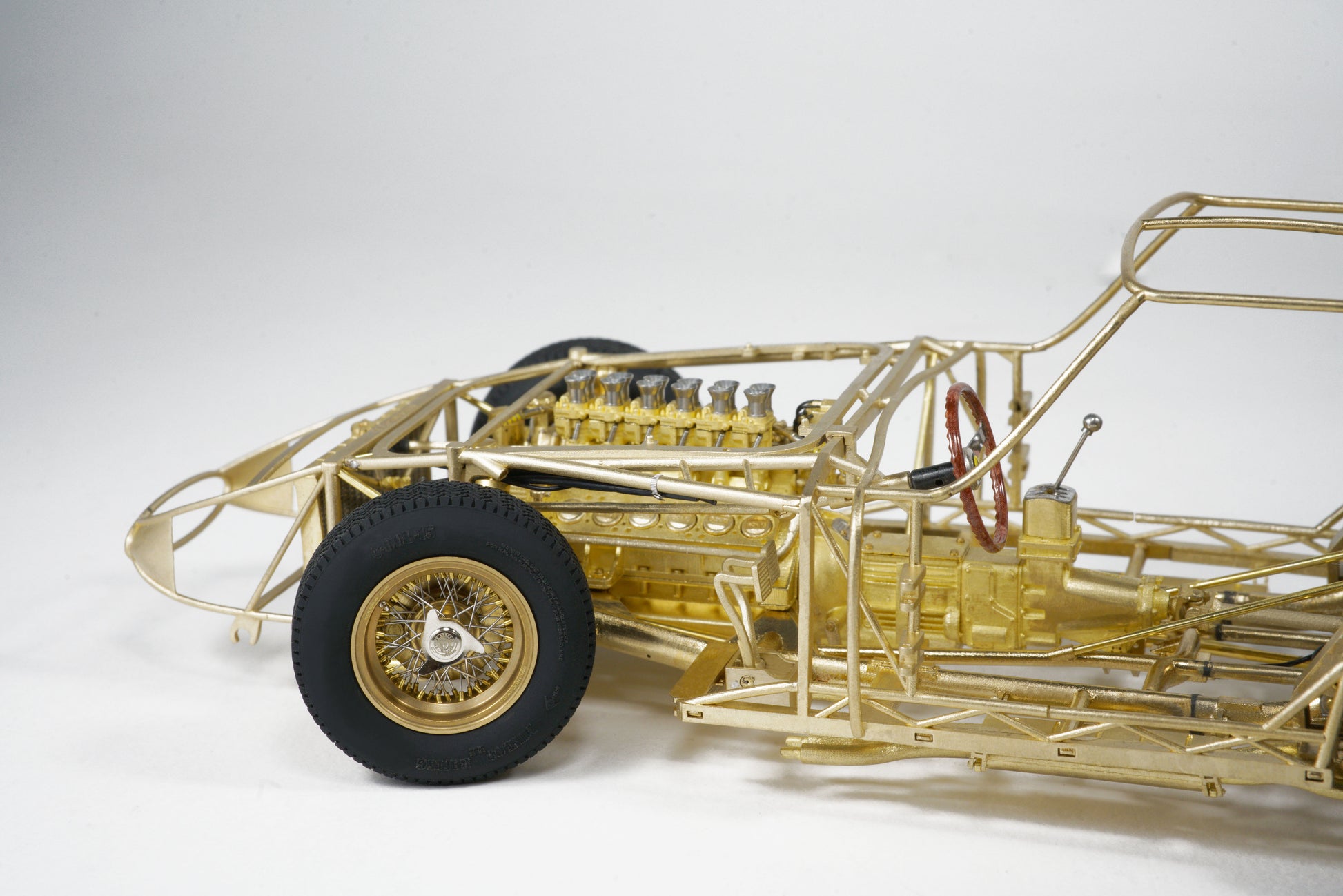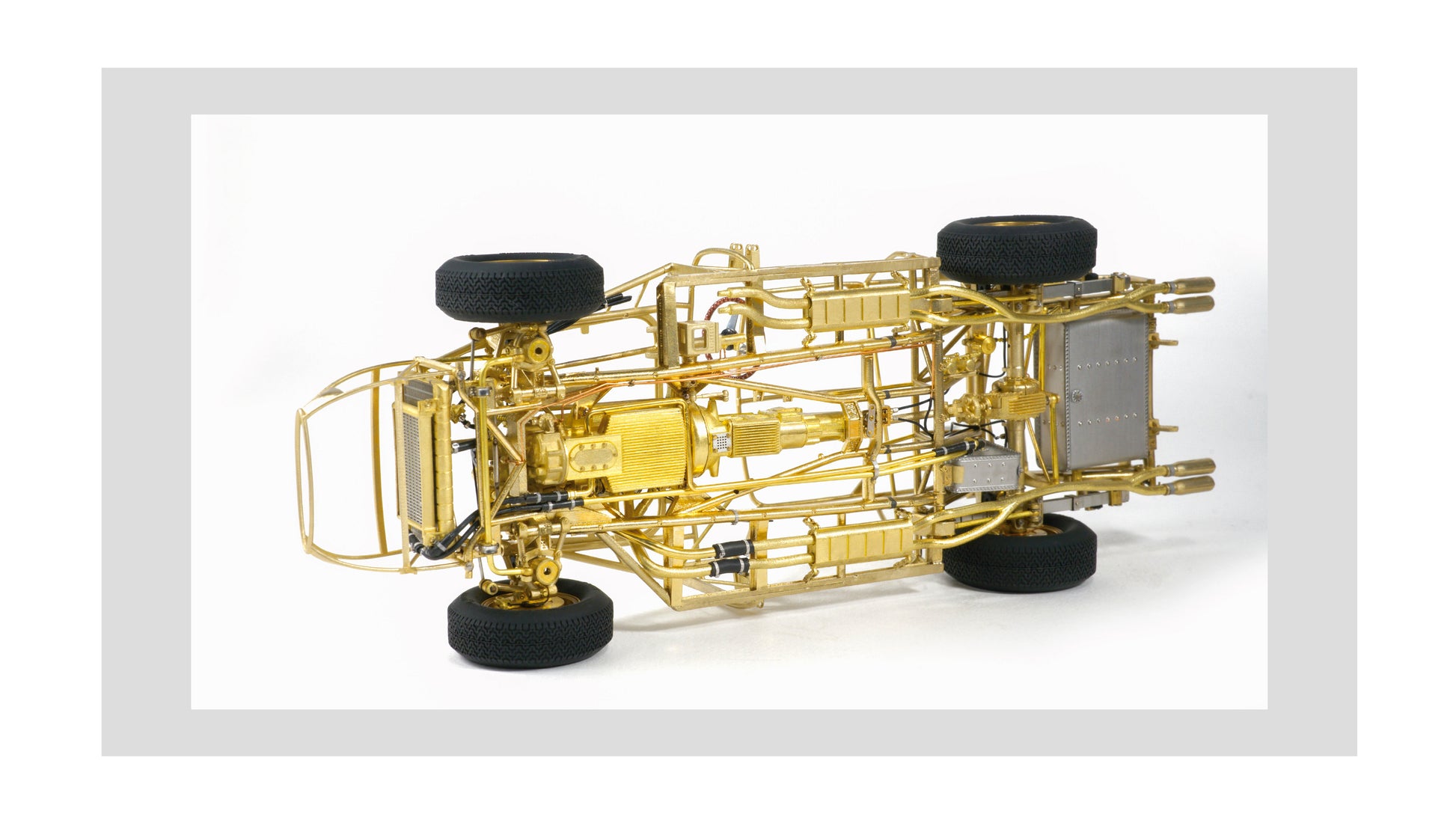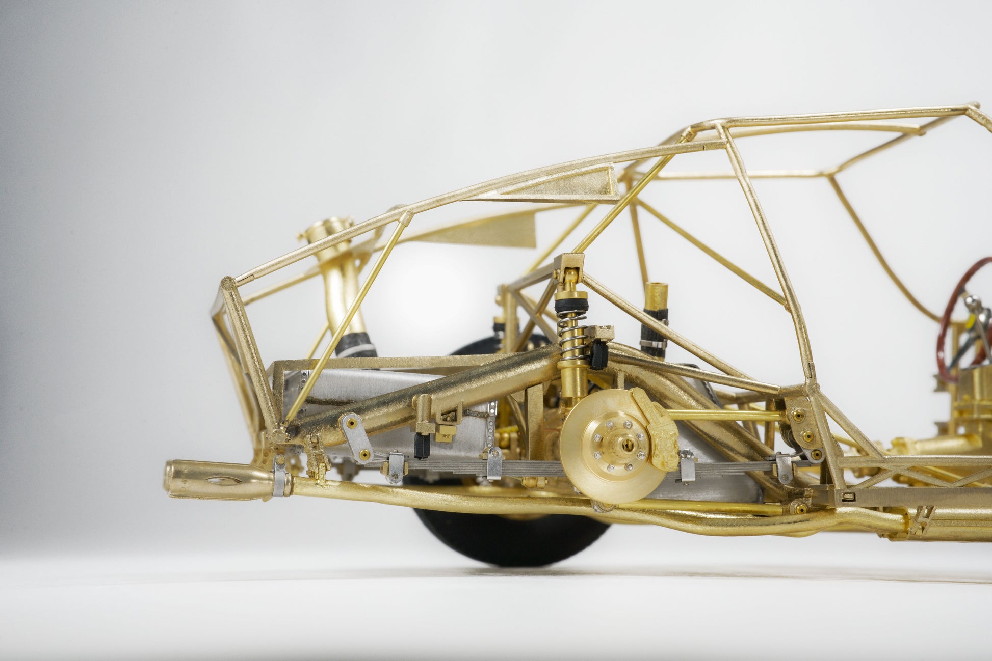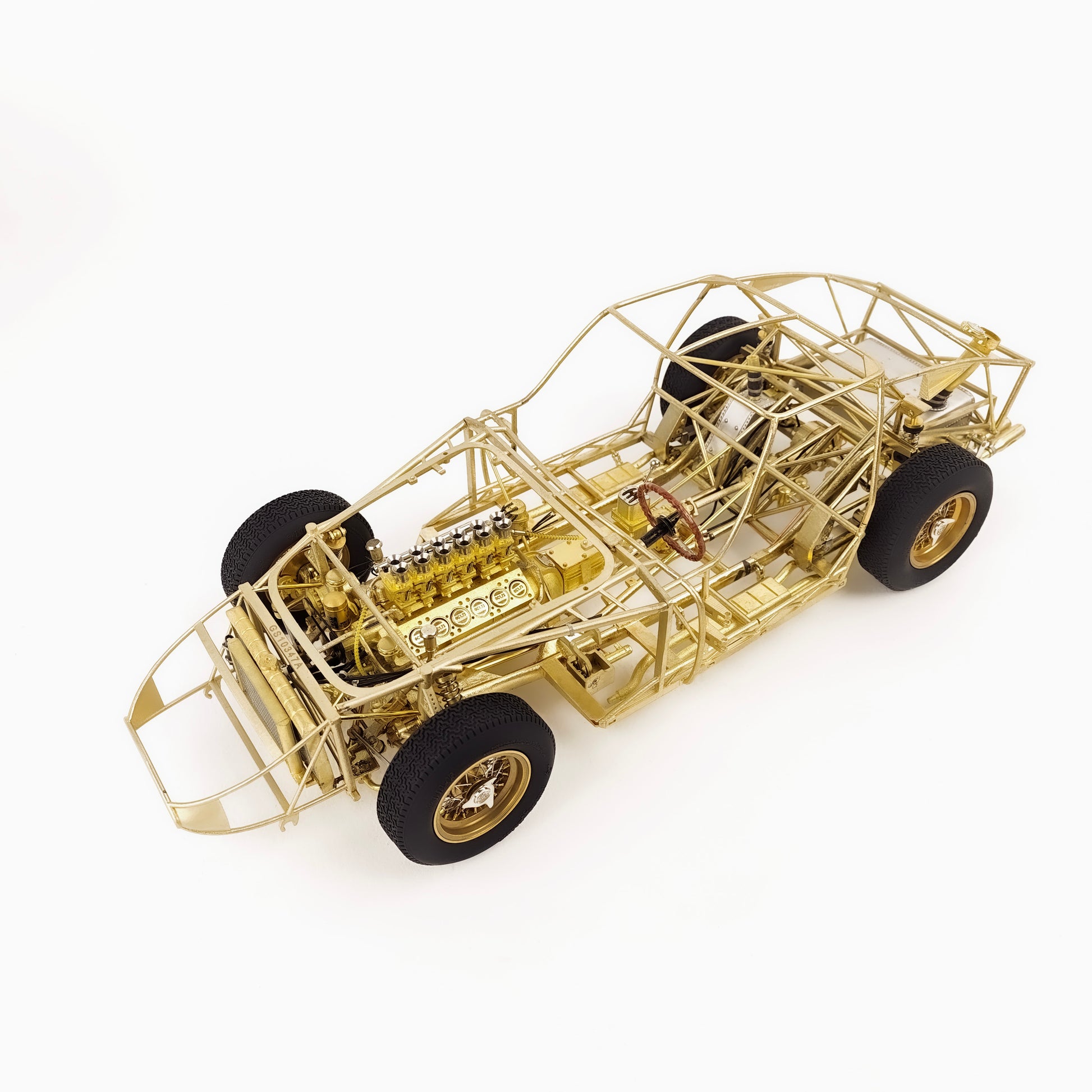 This model captures every structural and mechanical detail of the original chassis, from the authentic frame rails and suspension geometry to the finely replicated engine block, transmission, and exhaust system. With over 1,400 parts and 95% copper-based materials, the chassis achieves unparalleled authenticity. The use of multiple materials—such as stainless steel, glass, rubber, and more—ensures a true-to-life representation.