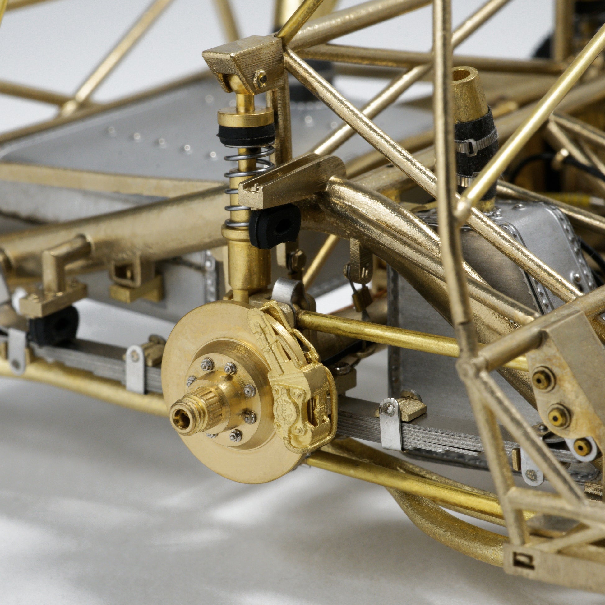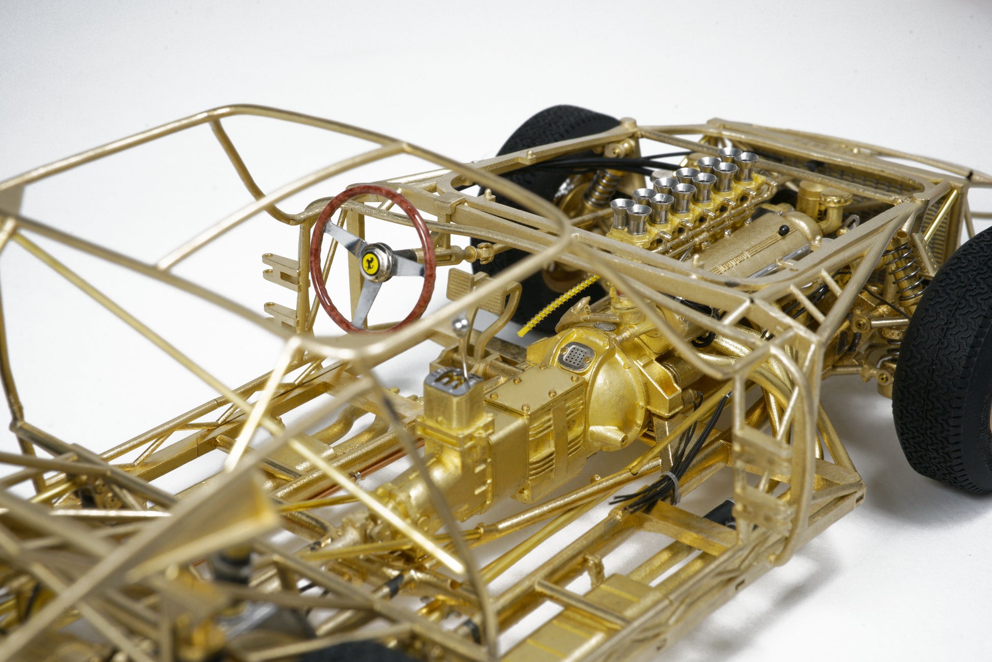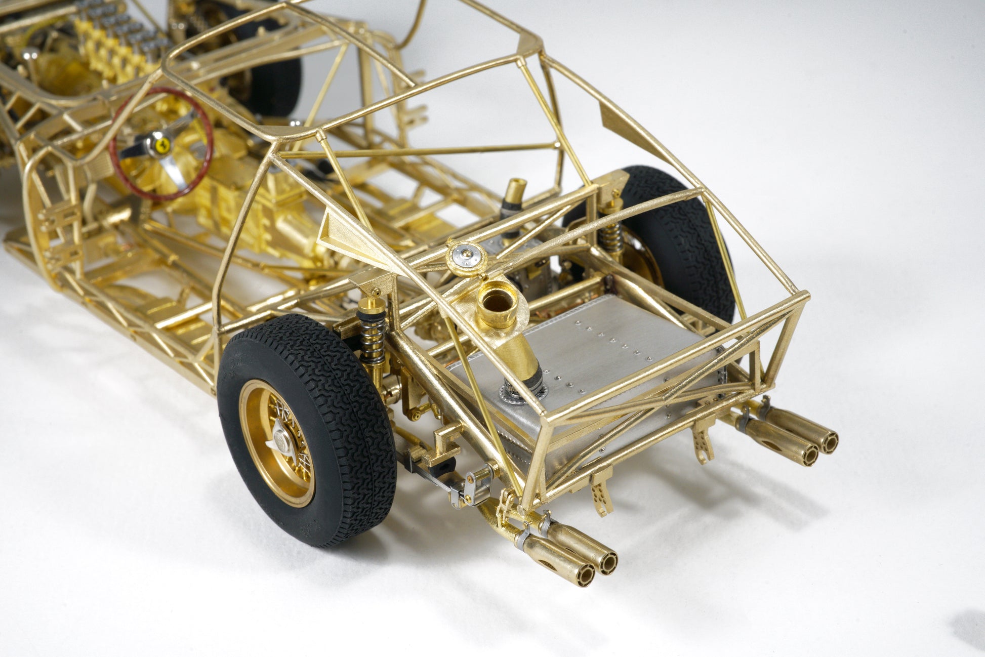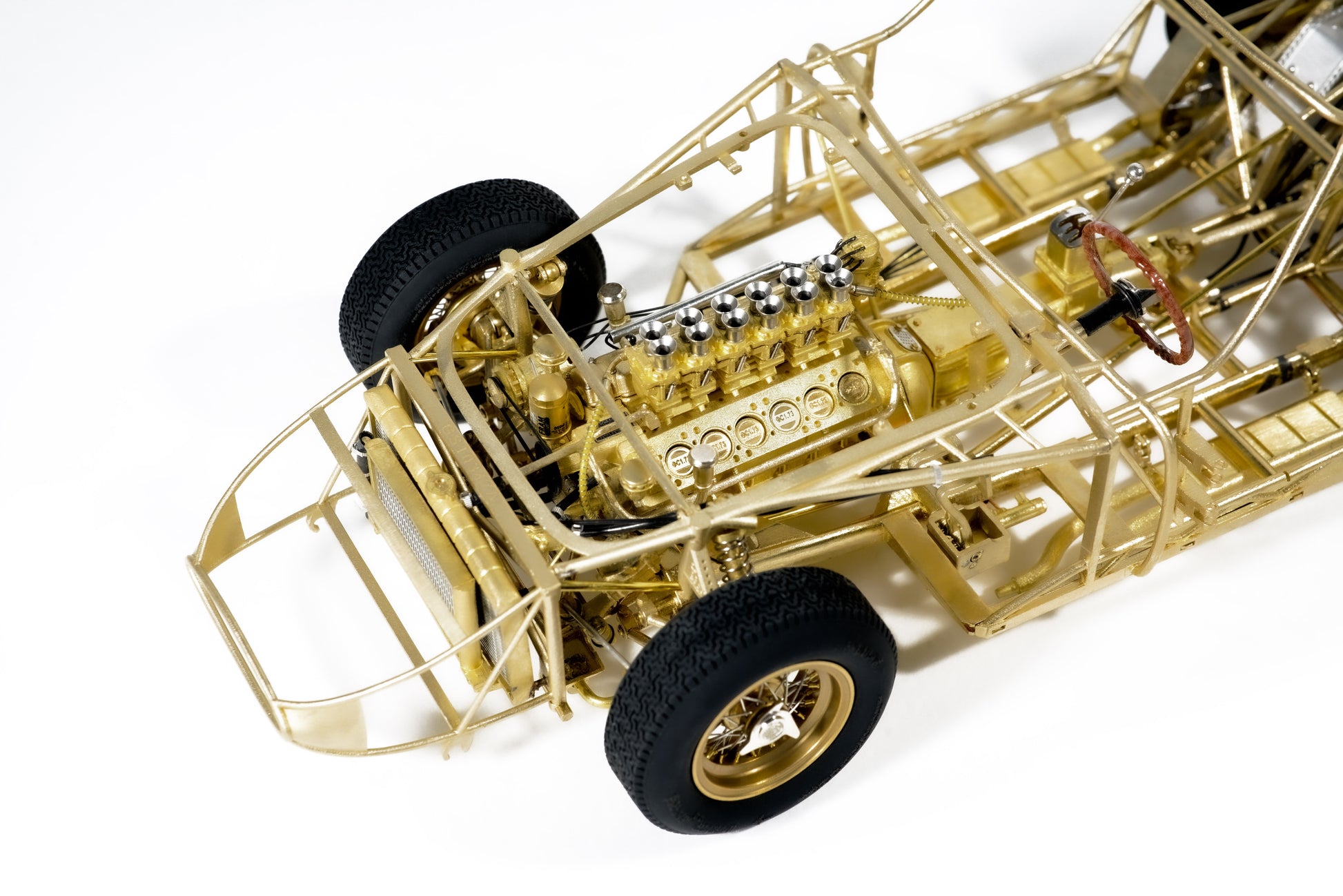 This model captures every structural and mechanical detail of the original chassis, from the authentic frame rails and suspension geometry to the finely replicated engine block, transmission, and exhaust system. With over 1,400 parts and 95% copper-based materials, the chassis achieves unparalleled authenticity. The use of multiple materials—such as stainless steel, glass, rubber, and more—ensures a true-to-life representation.