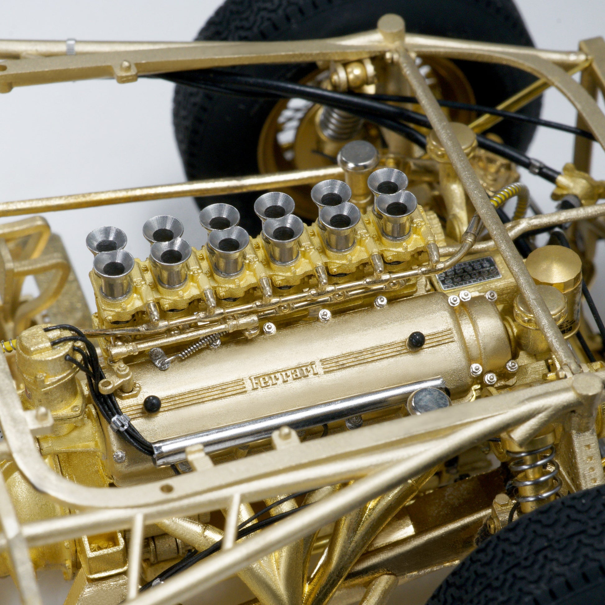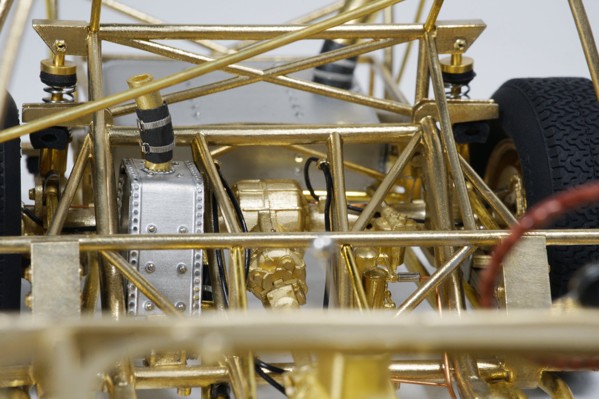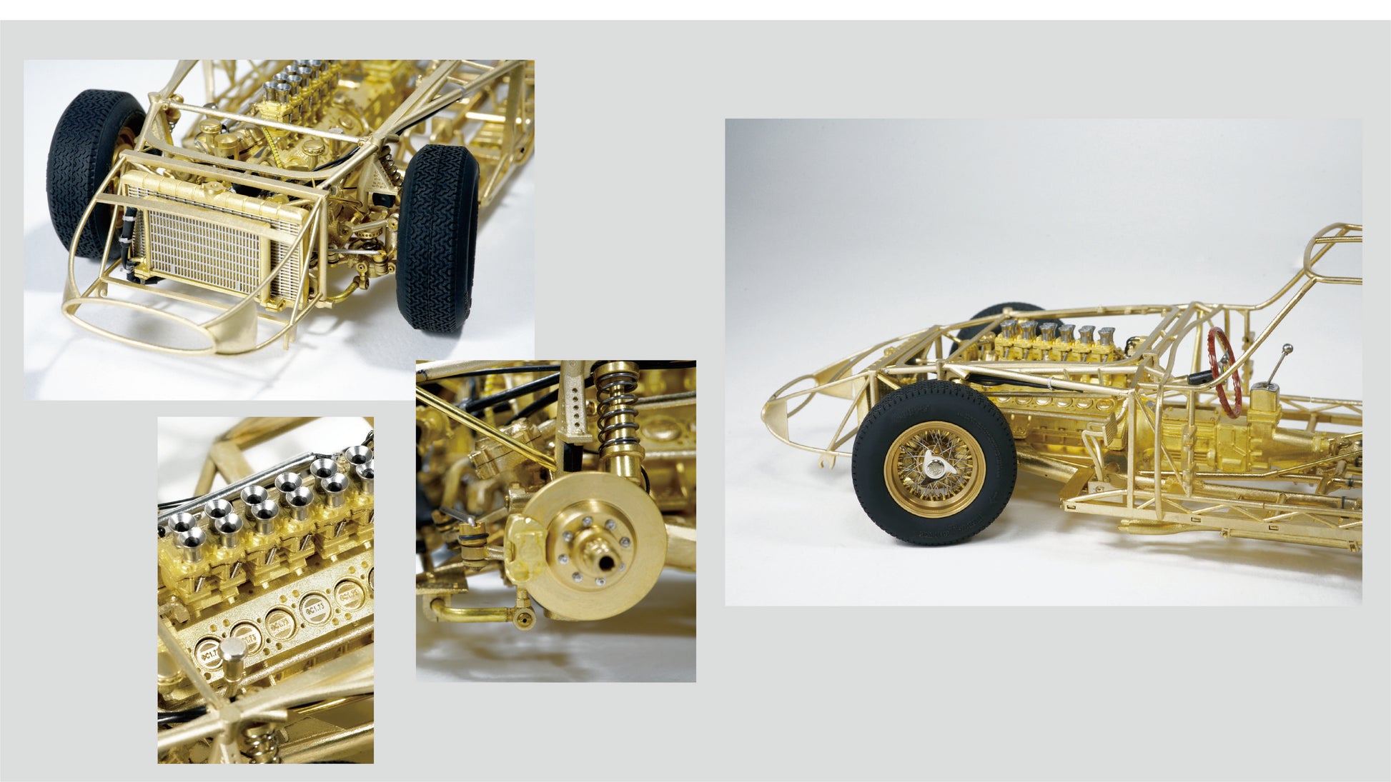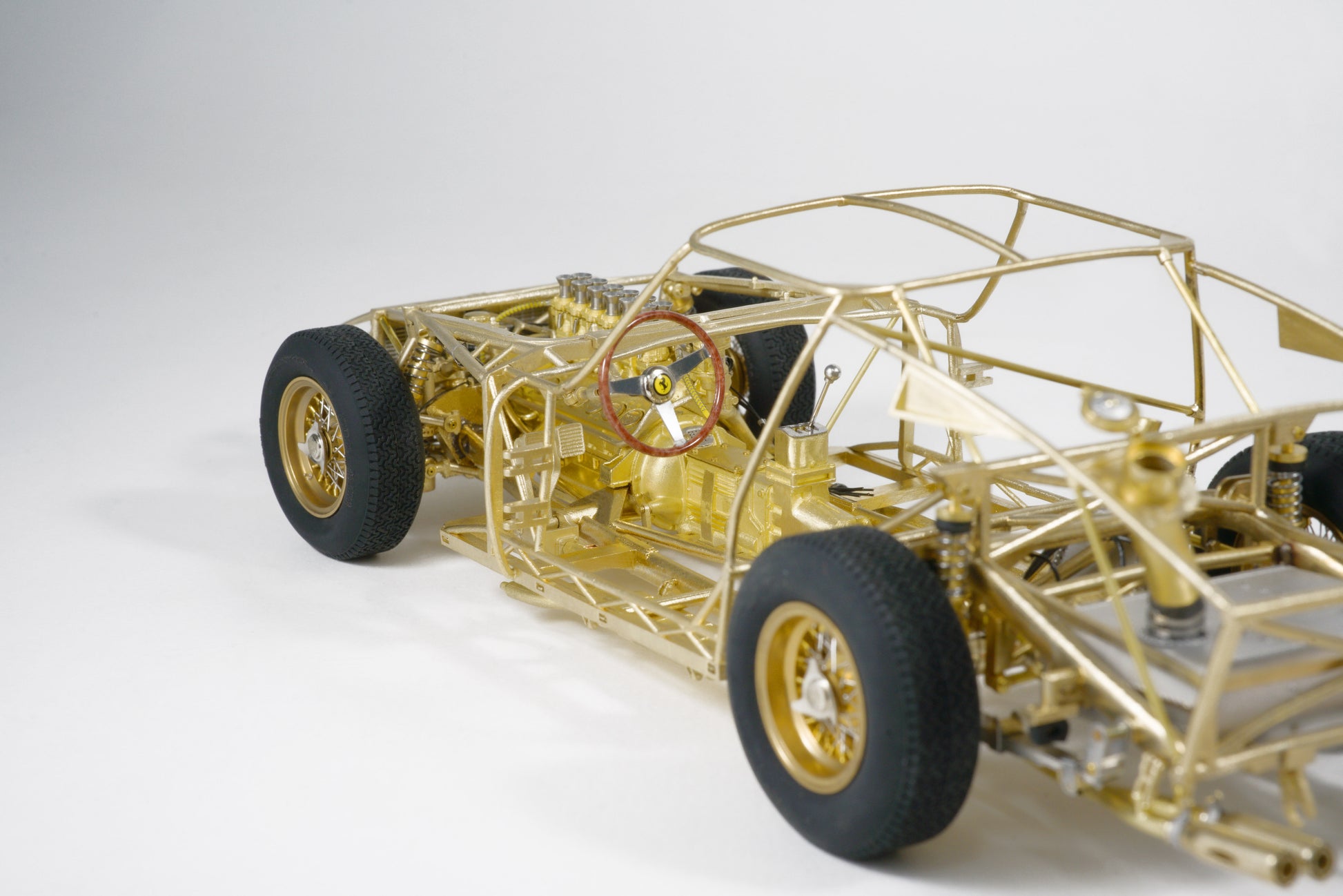 This model captures every structural and mechanical detail of the original chassis, from the authentic frame rails and suspension geometry to the finely replicated engine block, transmission, and exhaust system. With over 1,400 parts and 95% copper-based materials, the chassis achieves unparalleled authenticity. The use of multiple materials—such as stainless steel, glass, rubber, and more—ensures a true-to-life representation.